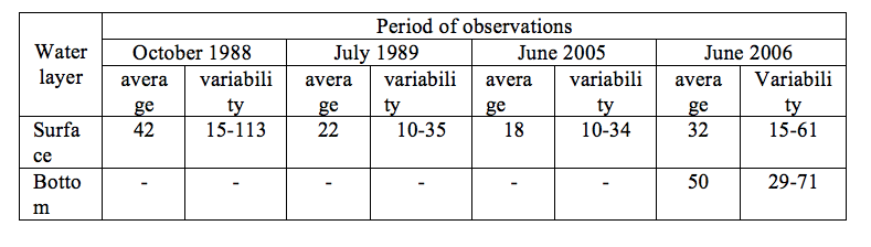 The results of the study of the content of suspended matters in the waters of the Amur estuary are presented in Tables 1, 2, 3, 4. Research of suspended matters was performed at first by expeditions of Far Eastern labor camps (1936, 1940, in the system of Soviet Ministry of Internal Affairs), then by Primorsky Region Agriculture Institute (1971-1972), Far Eastern Regional Hydro-meteorological Research Institute – FERHRI, 1993. Later (1988-89; 2005-2008) the measurements were done during expedition researches of POI and Institute of Water and Ecological Problems (IWEP).