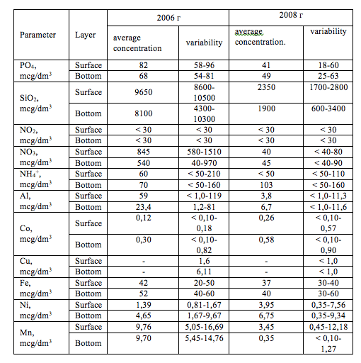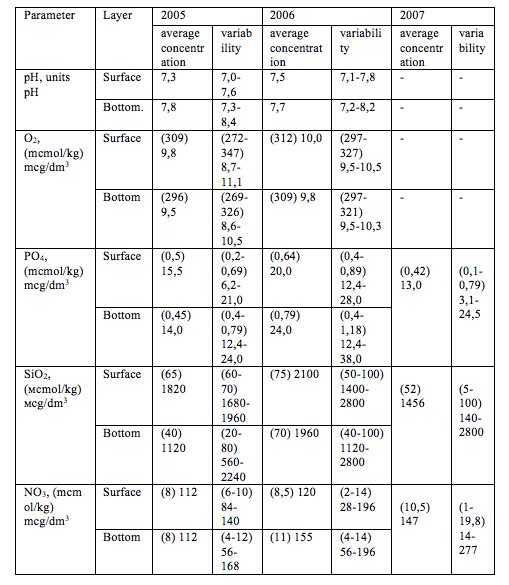 According to the available observations, the content of suspended matters (SM) in the waters of the Estuary may vary widely, depending on the area, from 3-114 mg/dm3 in the surface layer to 2-197 mg/dm3 in the bottom layer. The average concentration of SM in the water is 42 mg/dm3 and can increase significantly during a storm. A few observations during periods of severe storms show that the water turbidity in the estuary increases to 600-800 mg / dm3 [4]. Water turbidity reaches the maximum values in August-September, the minimum is observed in March. Tables 5-6 present the results of the study of individual hydro-chemical substances in the waters of the Amur estuary, based on the materials of hydro-chemical surveys of POI 2005-2007 and IWEP 2006, 2008.