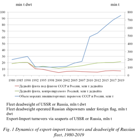 The transport fleet of the USSR consisted from about 1,800 vessels with a total deadweight of 22 million tons and transported annually up to 240 million tons, including about 6.5 million tons of Northern delivery. As you see on the slide, the cargo flow after sharp decrease because of economic situation in the result of the breakup of the USSR then is constantly increasing for twenty years, fig. 1.