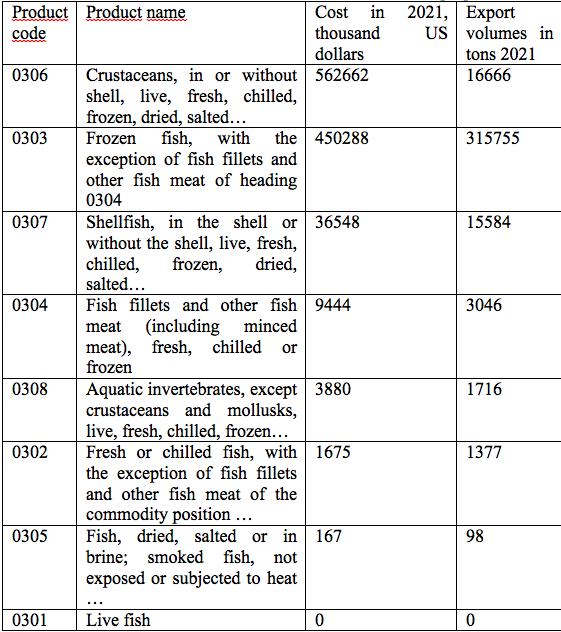 According to this table, it can be concluded that such goods as crustaceans, frozen fish, shellfish, etc. are exported in large quantities. It is important to note that live fish is not included in the export items, this is because the fish is a perishable commodity. Therefore, fish is transported mainly in frozen or chilled form. Frozen fish, depending on what kind it belongs to, is packed in bales, barrels, cardboard or wooden boxes, in which ice should be kept.