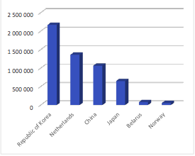 Russia is actively engaged in the export of aquatic biological resources, such as fish, marine animals and plants). The rating of Russia’s main trading partners in this area can be seen in Fig.2.