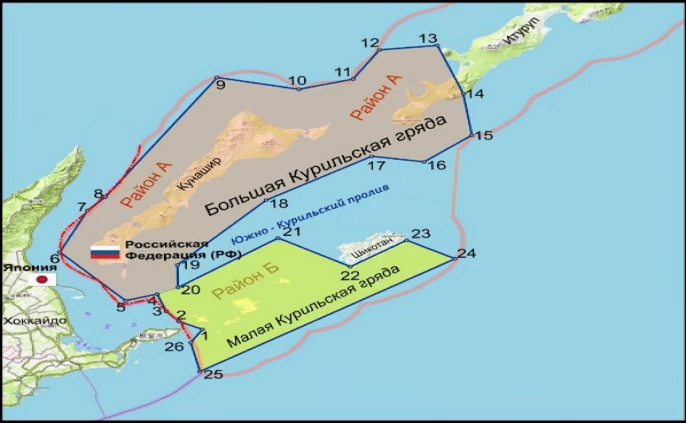 Fig. 1. Map-scheme of the marine area of harvesting bio resources by Japanese fishing vessels in the Russian territorial waters of the southern Kuril Islands and the Lesser Kuril Ridge under the 1998 Agreement. ©A.V. Brazhnik, PhD, Geological and Mineralogical Sciences.